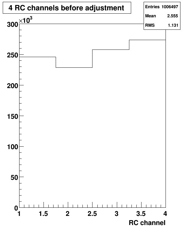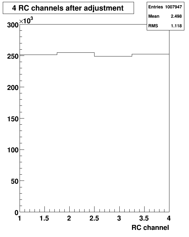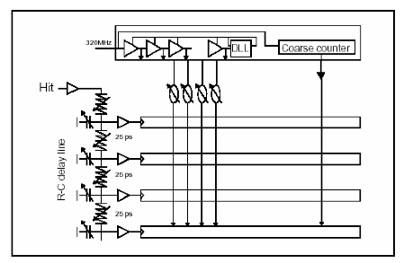 To achieve 25ps bin with 100ps clock, a signal is split into 4 different RC circuits. Value of C is adjustable with four 3-bit calibration constants. The goal is to have a change in a least-significant bit of time measurement for a random signal to occur with the same probability in all 4 channels. |