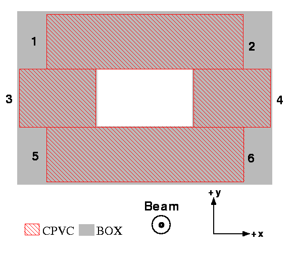 Assuming that the inner edges of the left and right sides of CPVC are aligned 0.5" from the edges of the hole in DEA (i.e. aligned with DEA scintillator), and that these side pieces are centered on the hole, yields the following positions for the elements: