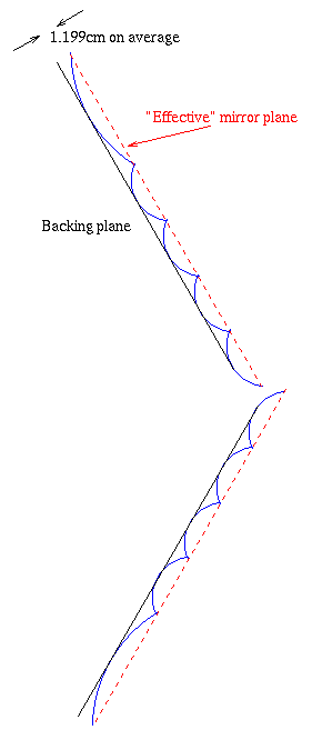 However the 3-dimensional geometry is not so simple, because different mirrors curve different amounts depending on the focus, and because the mirror corners are displaced further from the backing plane than the rest of the edges. The effective mirror plane is calculated using an average displacement of the mirror edge from the mirror backing plane, which could be off by +/- 1/8" or so from the true mirror edge.