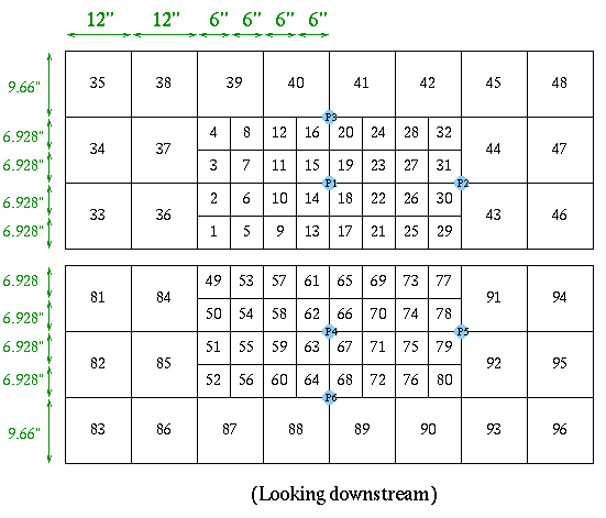 When you look in 3 dimensions however the mirror geometry is a little bit more complicated due to the curvature of the mirrors. The projections of points P1 through P6 onto the effective mirror plane are given in the table below. The absolute position and orientation within the MPS coordinate system is accurate to about 1/16" (0.16 cm) although the relative positions of these points P1-P6 (relative to each other) are accurate to perhaps a few mils.