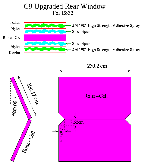 C9 was upgraded with a new rear window to accomodate the new hodoscope H9 for the E852 1997 run. The window consists of a sandwich of Tedlar, Mylar, Roha-Cell, Mylar, and Kevlar as shown in the figure below: